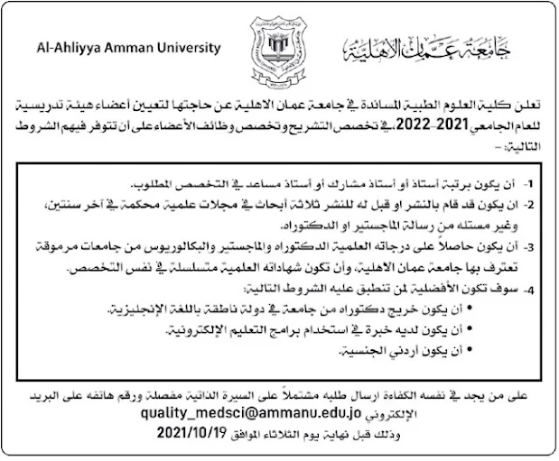 تعلن جامعة عمان الاهلية عن حاجتها للتعاقد مع أشخاص و ظائف شاغرة :